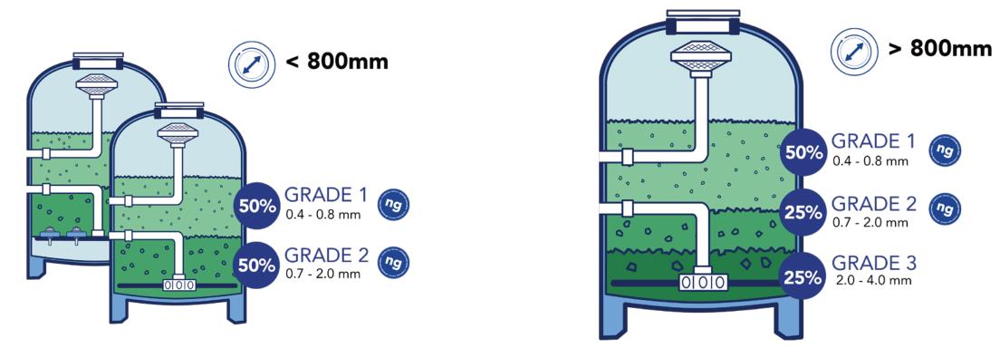 对于较小的过滤器(< Ø 800 mm 直径)和所有带有喷嘴板床的过滤器,无论过滤器直径如何:使用 50% 的AFM®ng1 级和 50% 的 AFM®ng2 级。